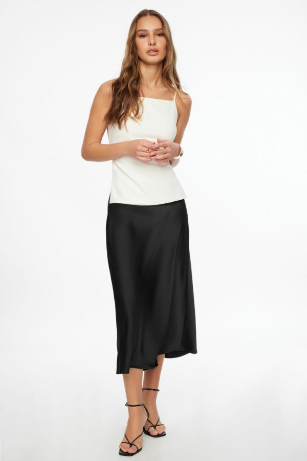 Sleek and sophisticated, this is a woven apron top – Designed to be fitted with a stretch and an open back.